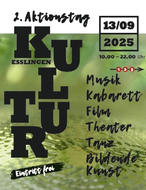 Das Netzwerk Kultur Esslingen veranstaltet am 13. September 2025 den 2.Esslinger AktionsTag KULTUR. 16 Mitglieder des Netzwerks werden an diesem Tag ihre Türen öffnen und unterschiedlichste Programmpunkte anbieten. Es werden nahezu alle künstlerischen Sparten zu erleben sein: Musik, Gesang, Theater, Tanz, bildende und mediale Künste. Ausschnitte aus Programmen, die in einer 15 Minuten Taktung ablaufen und parallel stattfinden runden den Tag ab. Der AktionsTag ist eine Leistungsschau der vielfältigen Esslinger Kulturbranche. Die kulturellen Angebote in unserer Stadt sind wichtiger denn je: Sie tragen in wesentlichem Umfang dazu bei, sich vielfältig mit unserer Lebensrealität auseinander zu setzten. Ganz gleich ob als Zuschauer oder als teilnehmender Akteur, brauchen wir diesen analogen Austausch und die Möglichkeit zur kulturellen Teilhabe aller Esslingerinnen und Esslinger. Alle Angebote und Aktionen sind kostenfrei.